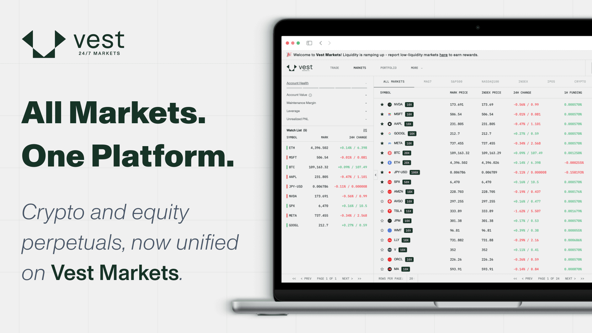 The company originally launched as Vest Exchange, a crypto-only perpetual DEX operating in a highly competitive market. As part of its evolution, Vest underwent a strategic rebrand to expand beyond crypto perps, repositioning itself for a broader, blue-ocean opportunity across multiple asset classes.