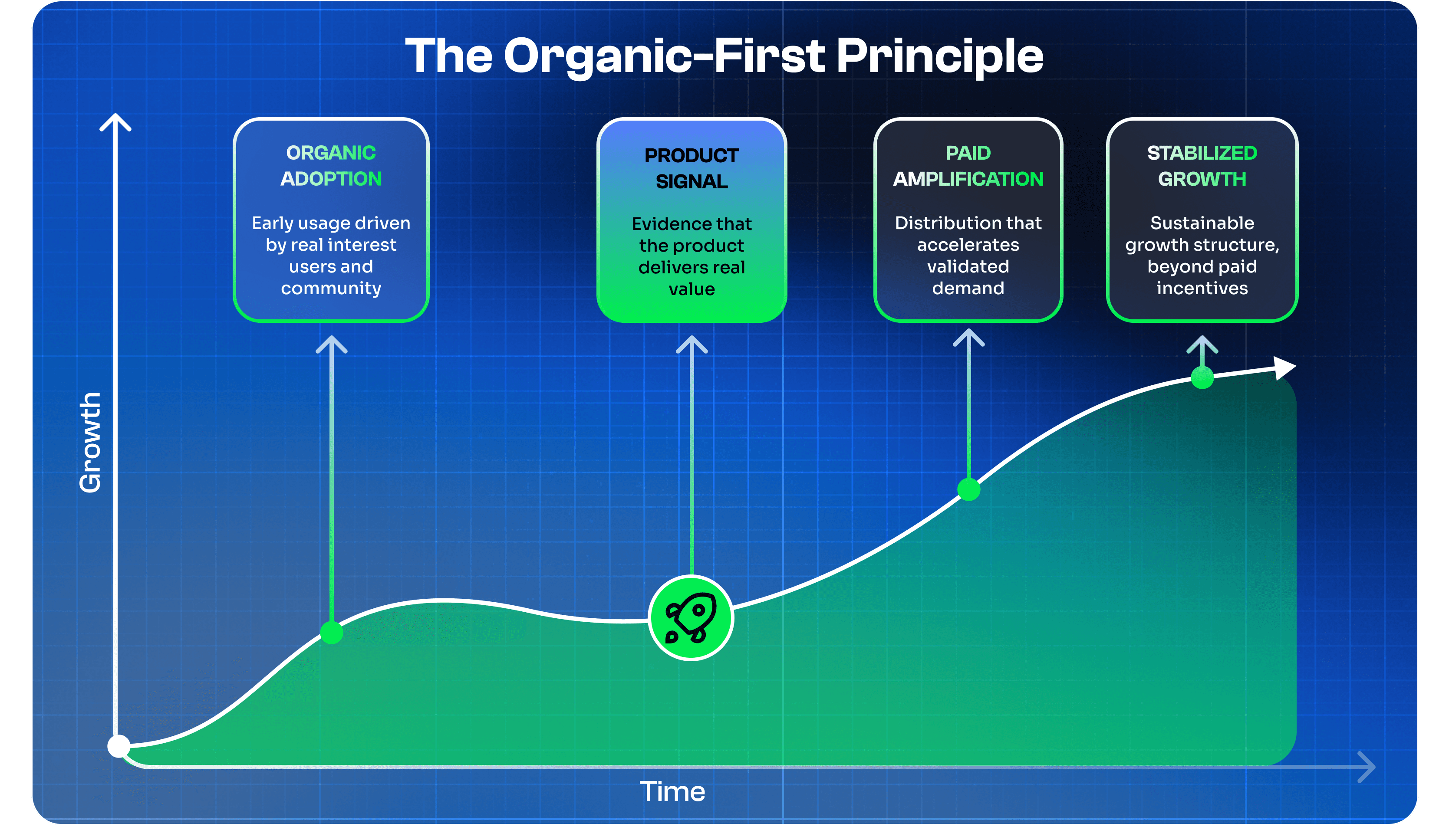 Only after these signals emerge does paid distribution act as amplification, accelerating growth rather than attempting to manufacture demand.