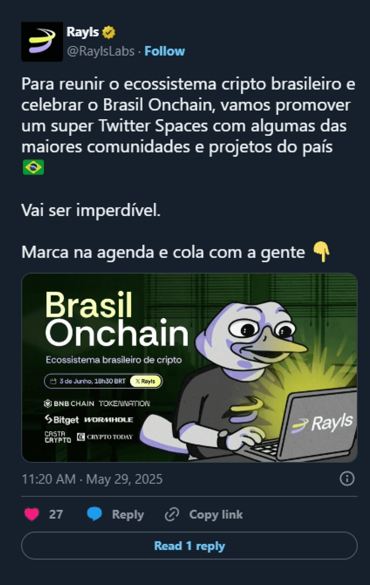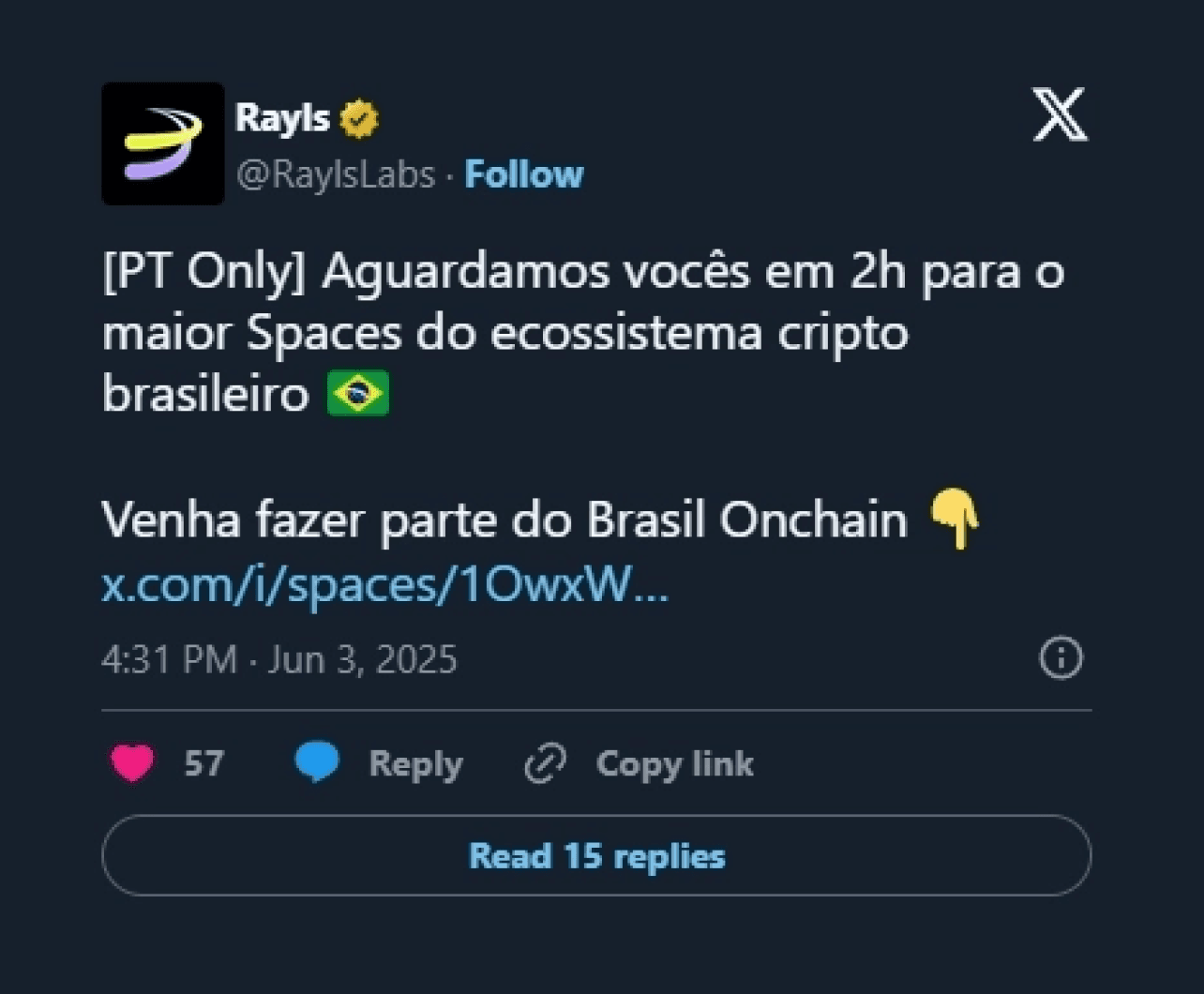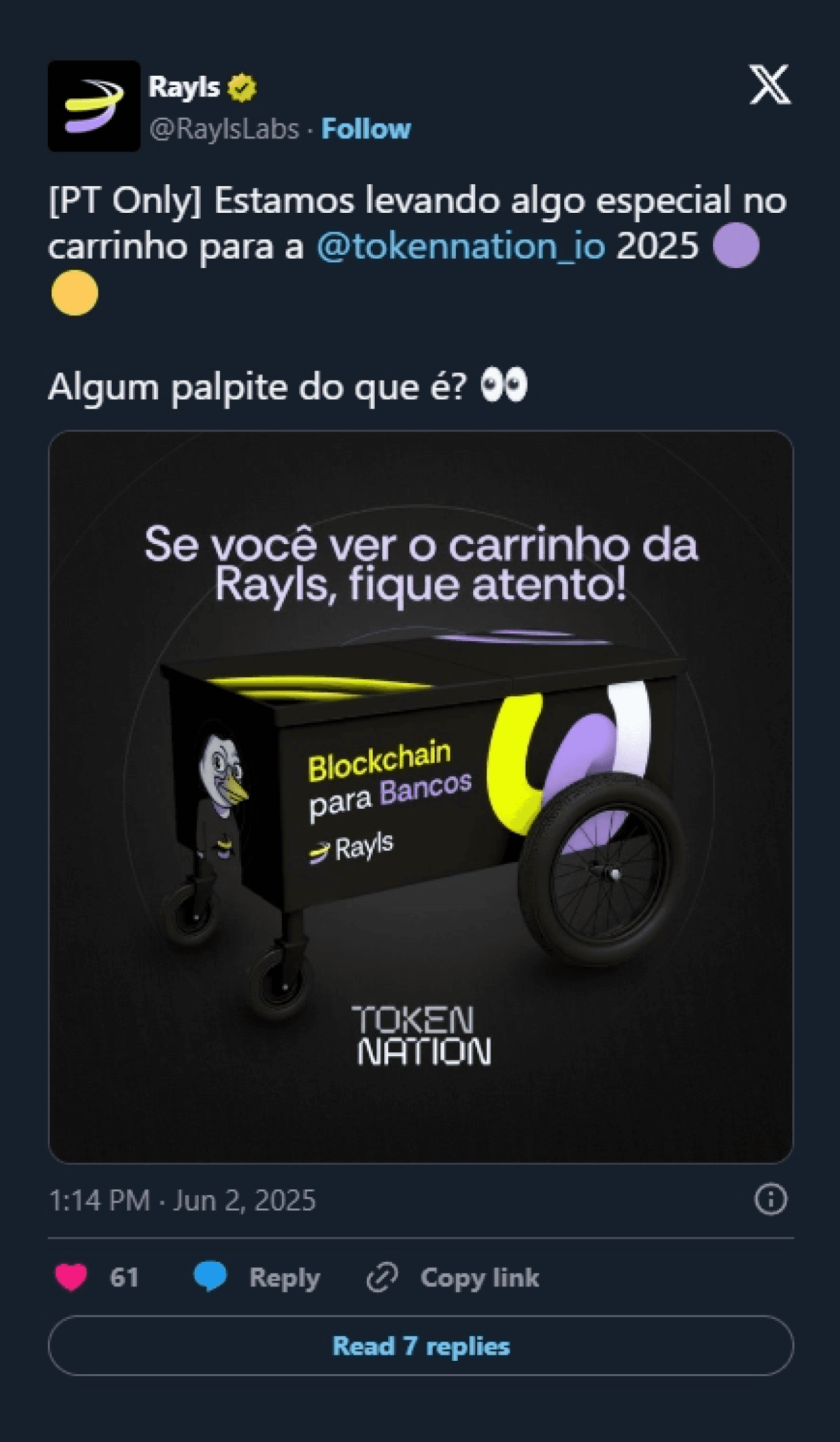 • Narrative Hook: The NFT drop was more than a collectible, it was a cultural signal. Framed as the first step in bringing banks onchain, Rayls launched its testnet exclusively to Brazilian users, where the team already had deep institutional roots. The goal? Help transition $100 trillion from TradFi to DeFi, starting with Brazil.