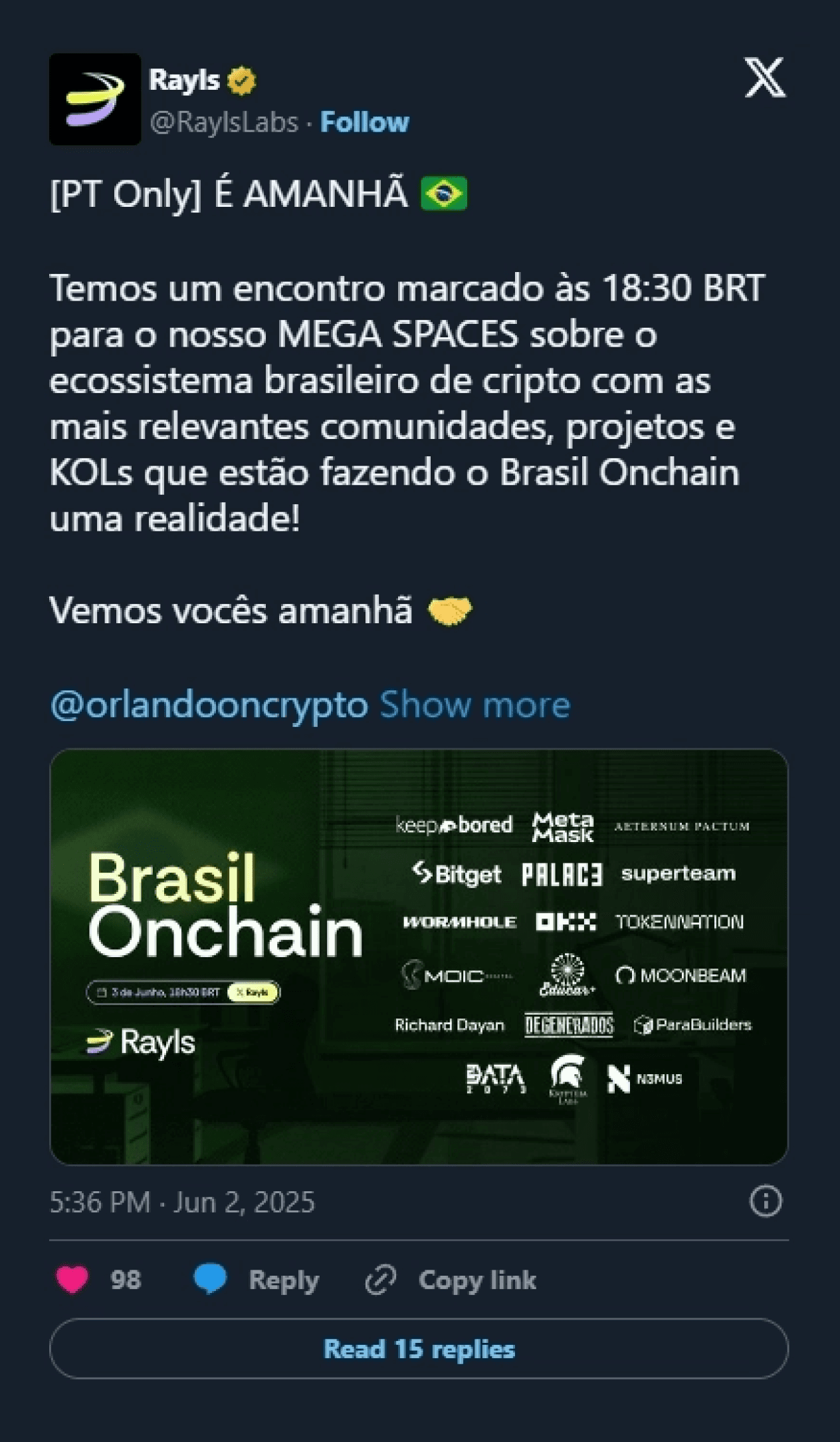 • Supported by creators and influencers such as: Orlando Telles, Casta Cripto, Victor Cioffi.